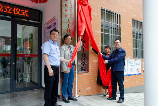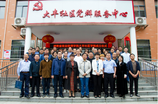5月21日上午,省商业技师学院大丰社区学院揭牌仪式在株洲市云龙示范区学林街道大丰社区党群服务中心隆重举行。株洲市职业教育协会(产教融合联盟)会长杨宋虎,学林街道办事处主任陈志勇、大丰社区党总支书记兼主任陈志新,省商业技师学院党委书记罗莹、院长蒙正炀及相关负责人参加揭牌仪式。