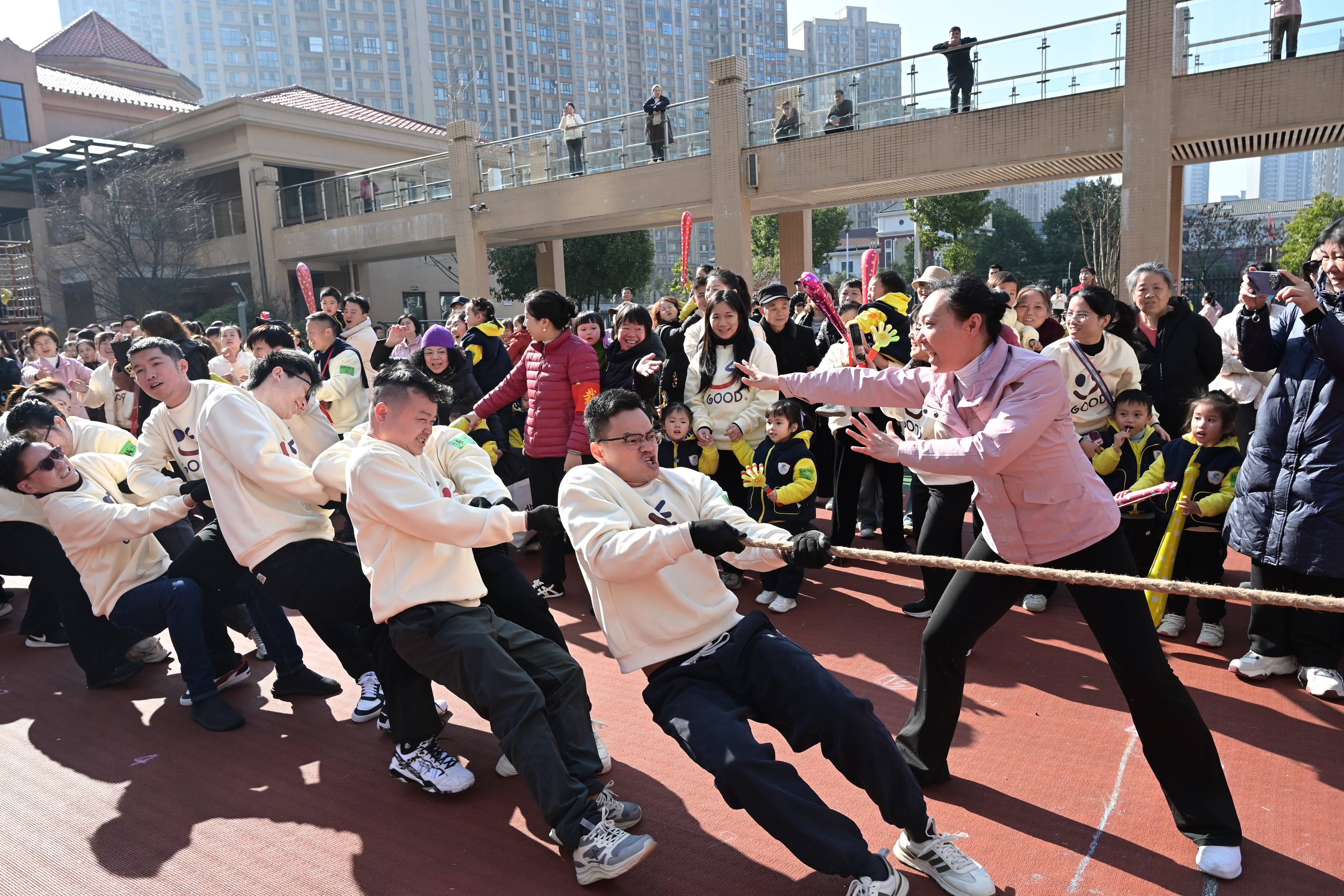 拔河比赛压轴登场,家长与教职工全力比拼,展现出团结奋进的精神风貌。