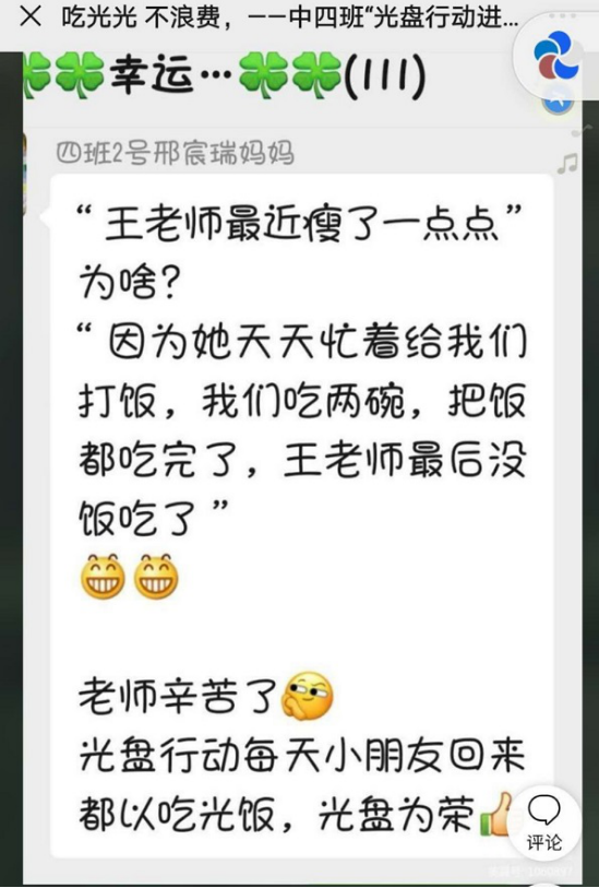 走进省三幼食堂,映入眼帘的就是“小餐桌大文明 光盘行动”倡议书,食堂阿姨“颠颠勺”,教职工们按量取餐拒“剩宴”,拒做“剩男剩女”成为一种新风尚。教室里,教师跟孩子们制作了宣传画、光盘签到处,将光盘行动和点灯游戏相结合,让孩子们在潜移默化中培养节约意识,增加用餐仪式感。萌娃们用光亮亮的饭碗,向大家证明“谁知盘中餐 粒粒皆辛苦”不是一句口号,而是一种行动与坚持。孩子们成就感爆棚,家长们反响热烈。
