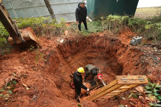 经过连夜排查,中央空调管道漏水点最终锁定市民之家北广场渗水聚集点约180米外的绿化带地下管道处,但此处地下管网非常复杂,周边紧邻75kV高压电线。湘潭市局工作人员利用双休日加班加点抢修,对漏水点区域进行开挖作业,并及时回填操作坑、同步恢复绿化,既确保了市行政中心中央空调的正常供暖,又守护了办事群众和干部职工的通行安全。