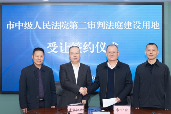 2023年12月6日,株洲市举行市中级法院第二审判法庭建设用地受让签约仪式。经株洲市政府批准,市中级人民法院、市审计局双方正式签约,将市审计局原办公楼宗地(建筑面积5055.93㎡)以协议方式转让给市中级人民法院,市财政局、市机关事务局见证签约仪式。