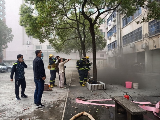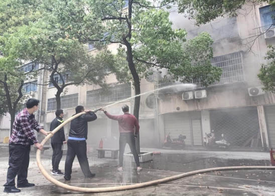 随着一阵阵“起火了”“快救火”的呼救声,只见原地税局宿舍5栋某户南向阳台上空调主机燃起大火,冒出浓浓黑烟并夹杂着刺鼻的塑料烧焦气味。金辉酒店值守员工闻火而动,立即拨打119报警,断掉电闸开关,一边查看是否有人被困,一边拿起灭火器、消防泵进行灭火,不到5分钟就将大火扑灭。随后消防车到达现场,消防队员戴着氧气罩冲进室内将余火扑灭,一场有惊无险的事故,终于平息。