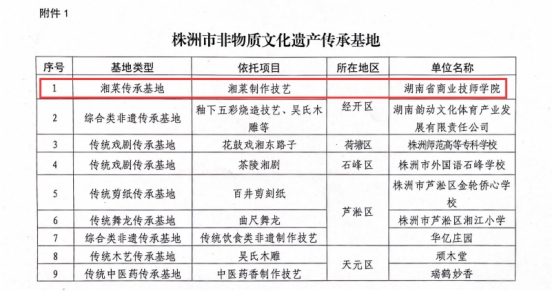 10月13日,株洲市公布了一批市级非物质文化遗产传承基地,其中,省商业技师学院被授予“湘菜传承”基地称号。