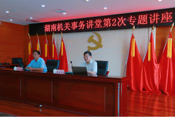 为全面深入学习贯彻习近平新时代中国特色社会主义思想,推动“政治机关、行政机关、服务机关、专业机关、清廉机关”建设,更好地提升党员干部干事创业本领,省机关事务管理局于9月26日组织开展湖南机关事务讲堂第2次学习活动。本次讲堂由中南大学商学院教授、湖南省政协经科委主任、九三学社湖南省委副主委吴金明主讲,主题为《落实“三高四新”战略 建设节约型机关》。