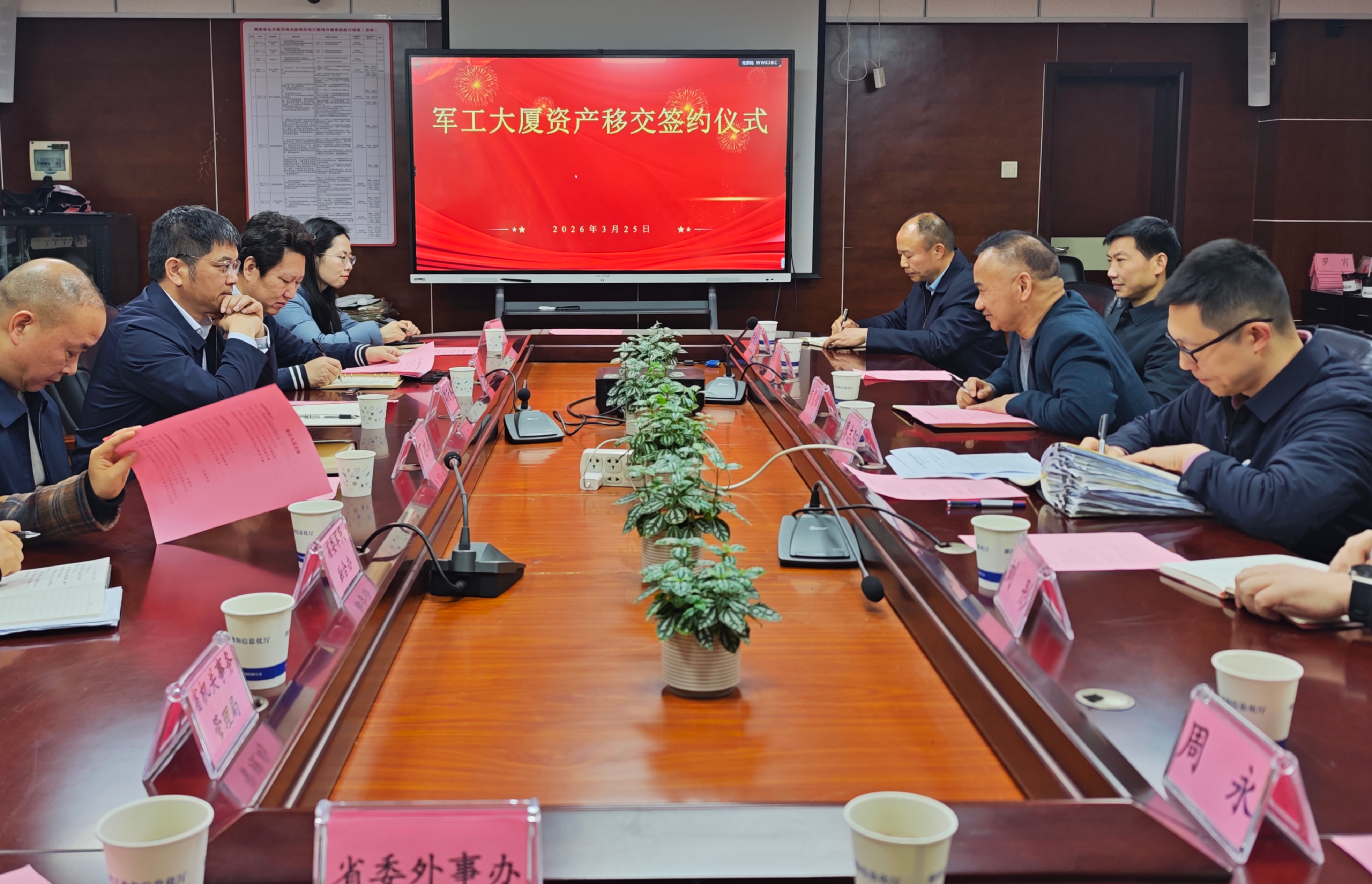 军工大厦办公场地移交协议由省委军民融合办、省国防工会、省机关事务局、省委外事办四方共同签署。