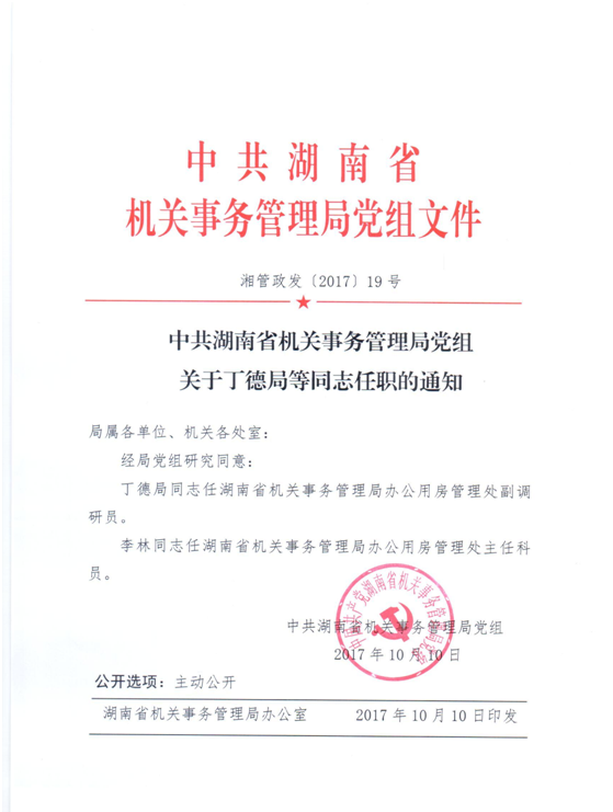 名称: 中共湖南省机关事务管理局党组关于丁德局等同志任职的通知