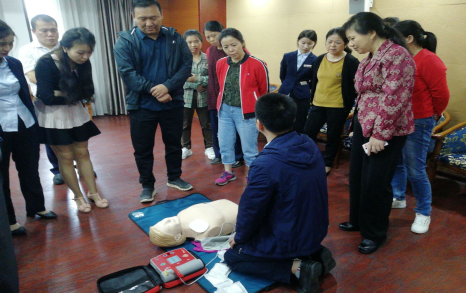 培训中,熊选政主任结合自己多年临床工作经验,对如何判断心跳呼吸停止、心肺复苏的特征、操作步骤、救助过程进行了详细讲授。随后,利用模拟人就如何实施心肺复苏抢救,包括判断是否意识丧失、胸外心脏按压、清理口腔异物、开放气道、人工呼吸、按压深度、按压频率等操作进行示范,着重强调了公共场合急救器材AED操作的重要性。