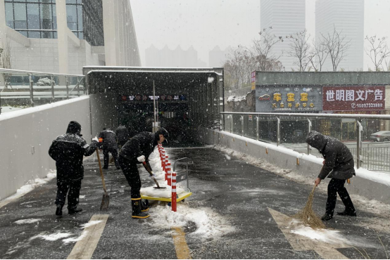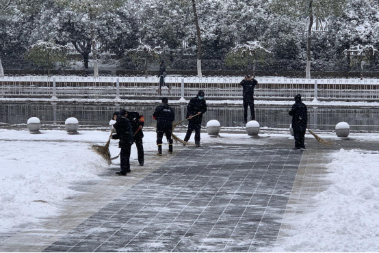 保障出入安全。组建应急队伍,实行24小时巡查制,重点关注路面、外墙、楼顶积雪情况,对办公区主要交通路段路面进行集中铲雪除冰、撒盐融雪,确保重要路段安全畅通;在出入口铺置防滑毯、张贴安全警示,确保行人出入安全;检查中央空调、水管电路等基础设施设备运行情况,加强供暖设备维护保养,科学合理设置开启时间,保障室内供暖绿色安全。